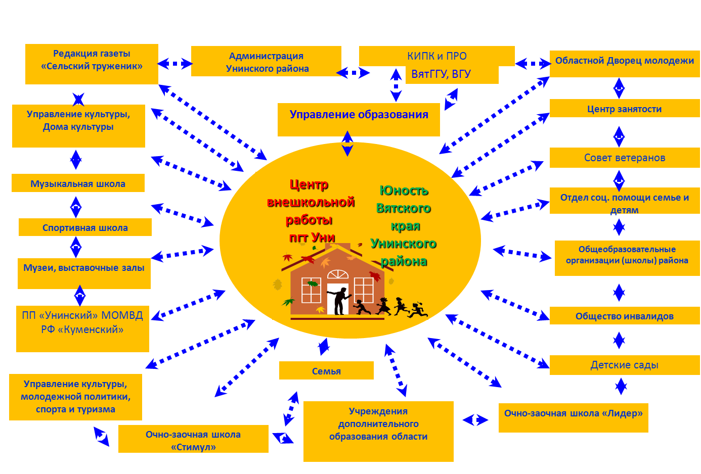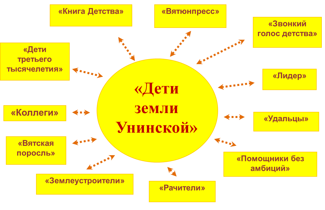 Реализуя программу «Дети земли Унинской», районная детская организация взаимодействует с учреждениями, организациями и различными структурами пгт Уни: