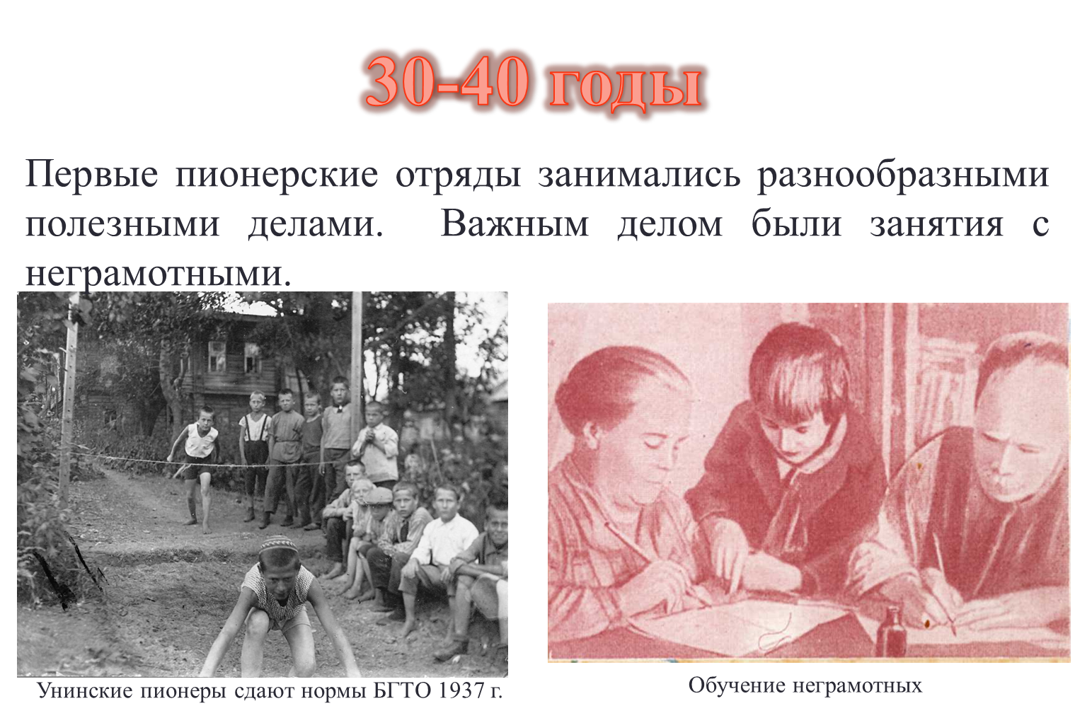 Первые пионеры помогали старшим восстанавливать разрушенное после гражданской войны народное хозяйство, активно участвовали в коллективизации деревни и в борьбе с неграмотностью.